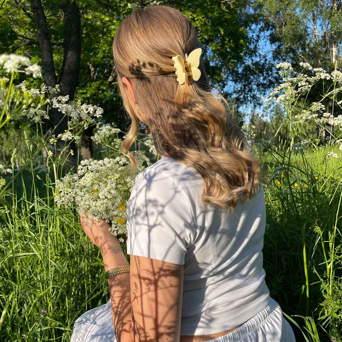 Die Haarspange in Form eines hübschen Schmetterlings ist speziell für Halbhochsteckfrisuren entwickelt und eignet sich für sowohl dünnes als auch dickes Haar. Die matte Oberfläche mit extra griffigen Zähnen auf der Innenseite und die extra starke Feder sorgen dafür, dass die Haarspange wirklich an Ort und Stelle bleibt. Eine schnelle und einfache Möglichkeit, das Haar in eine süße Frisur zu bringen und gleichzeitig dein Outfit für alle Sommerabenteuer mit dieser Schmetterlingshaarspange zu ergänzen!
